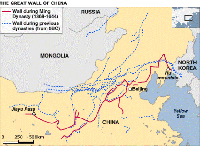From the 3rd century BC to the 17th century, the Chinese continued to extend the Great Wall. The last dynasty, which repaired the Great Wall and used it for defense, was the Ming Dynasty that reigned between 1368-1644. The parts of the walls built by the Ming Dynasty on the map are red, the walls previously made in blue.